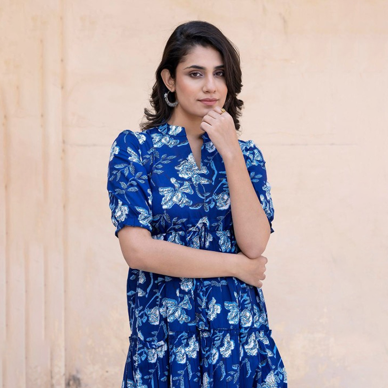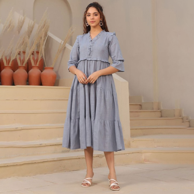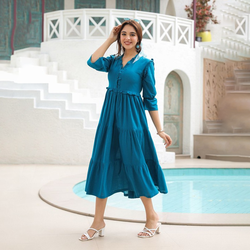 V-Neck Bell Sleeves Pure Cotton Tiered Fit & Flare Midi Dress