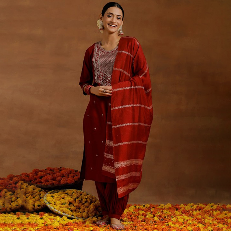 Yellow and red embroidered lehenga choli with dupatta, sequinned Yellow and red embroidered ready to wear blouse, has a square neck, sleeveless, zip closure Yellow and red solid ready to wear lehenga, has zip closure, flared hem Yellow and red solid dupatta, taping border Size & Fit The model (height 5'8) is wearing a size S The model (height 5'8) is wearing a size S Material & Care 100% Roman Silk